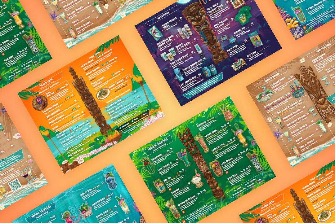 A fully illustrated menu design for Hidden Harbor, one of the top tiki bars in the world.